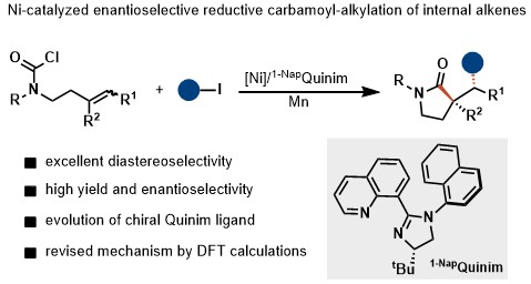 Recently, the research group of Professor Chen Yifeng from the School of Chemistry and Molecular Engineering, and the Joint Research Center of Feringa Nobel Prize Scientists, ECUST has made new progress in the field of asymmetric catalytic conversion of olefins. The related research article was published in German Applied Chemistry with the title of “Nickel-CatalyzedEnantioseselective Reductive Alkyl-Carbamoylation of Internal Alkenes”.